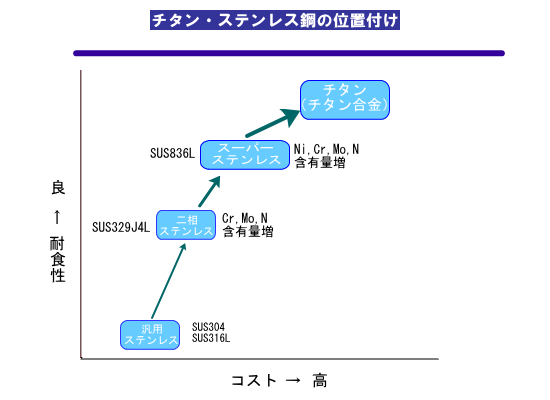 スーパーステンレス鋼は、高NI、高Cr、高Mo、を含有する高耐食ステンレス鋼で、海洋鋼構造物を製塩プラント及び高塩化物を含んだ食品工業で優れた耐食性を有しており、環境によっては高ニッケル基合金や純チタンに匹敵する耐孔食性、耐すきま腐食性を有する経済性の高いステンレス鋼です。